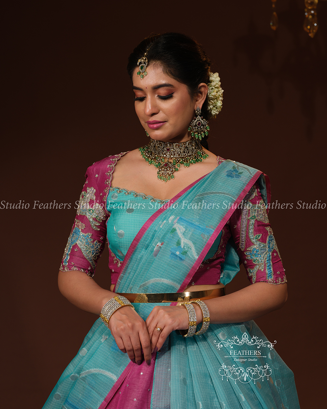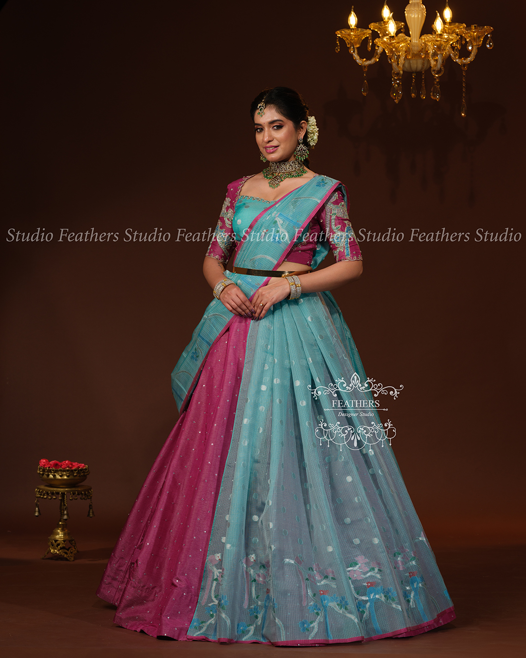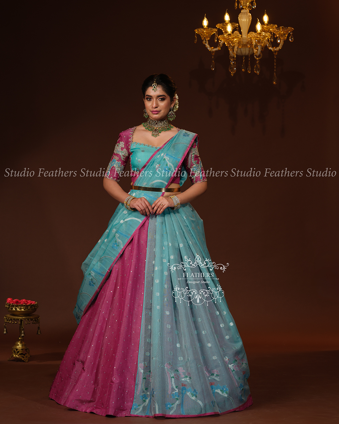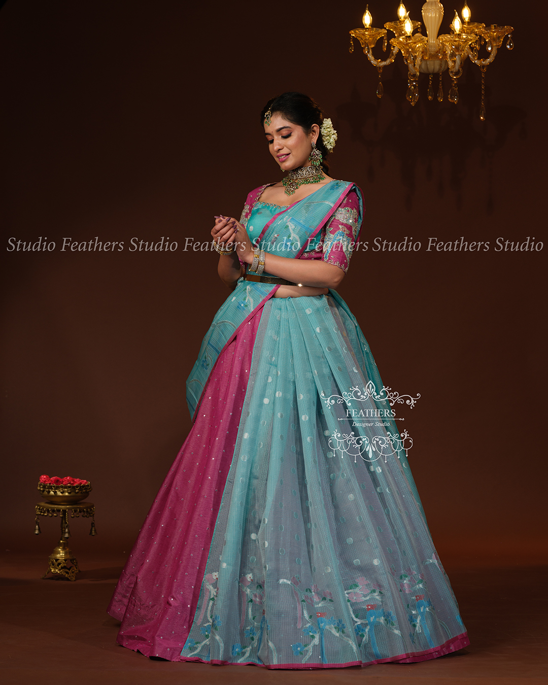 Netted flared skirt paired with Rawsilk work blouse and organza ruffle dhupata