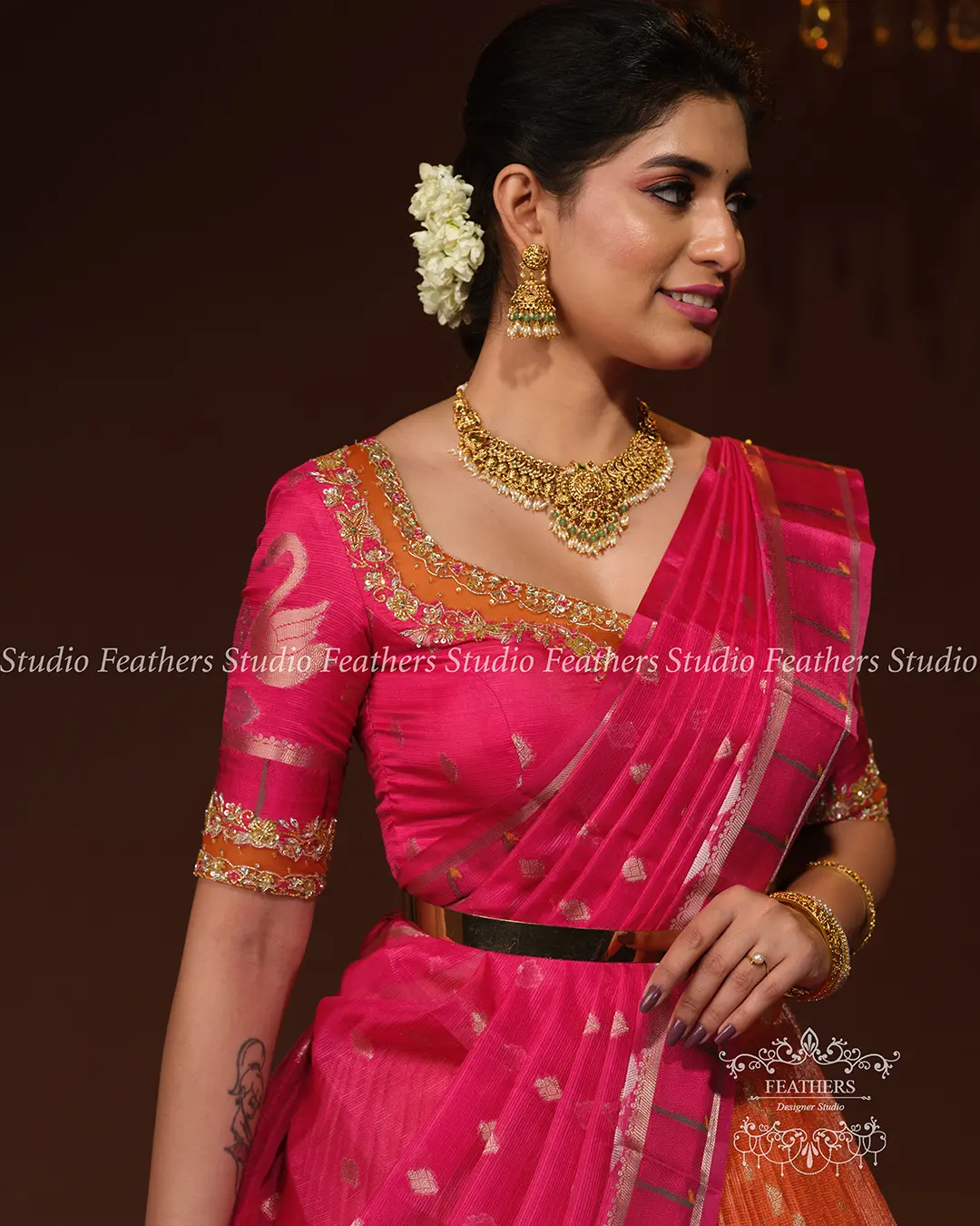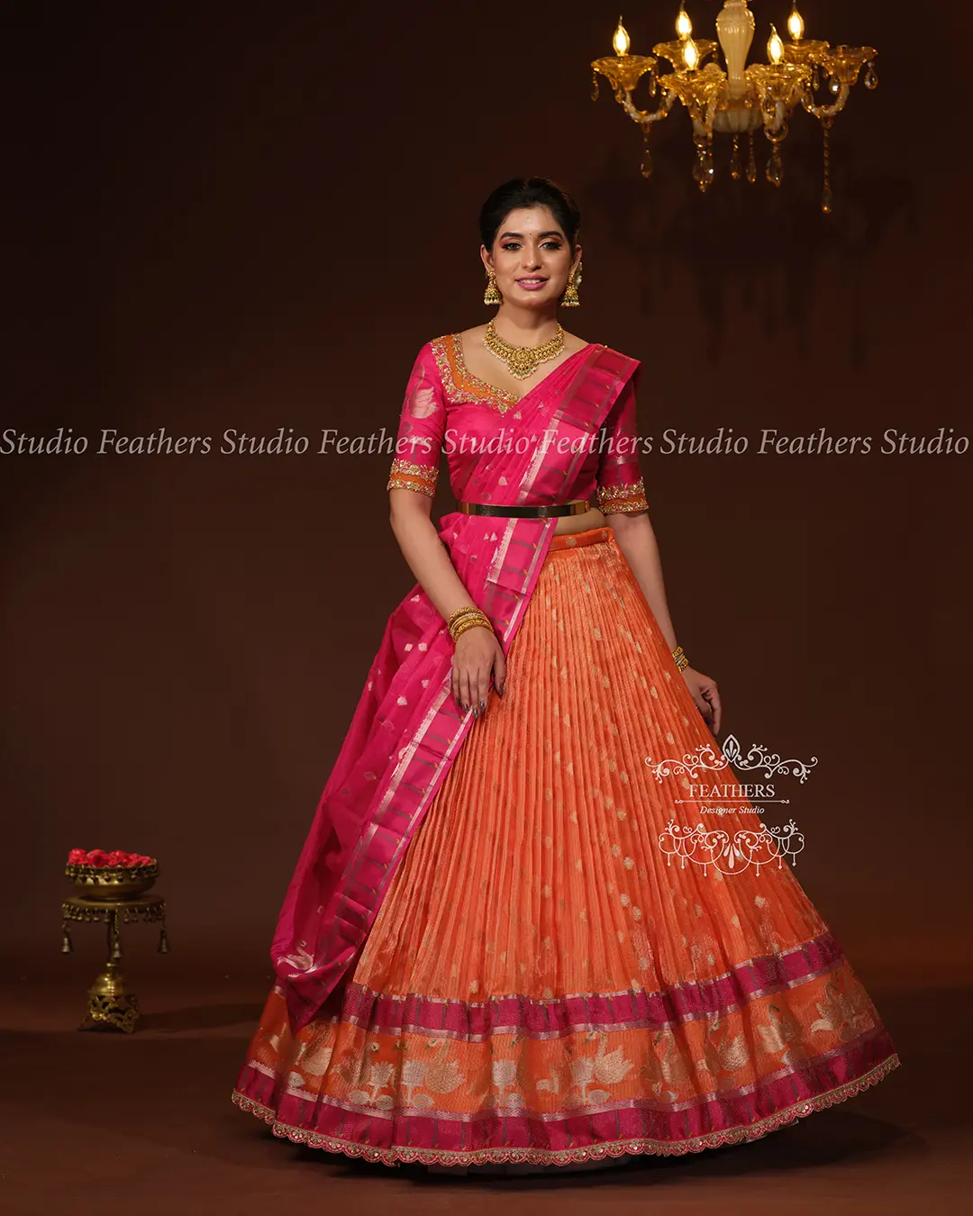 Embroidery pattern skirt paired with Rawsilk work blouse and hand work dhupata.